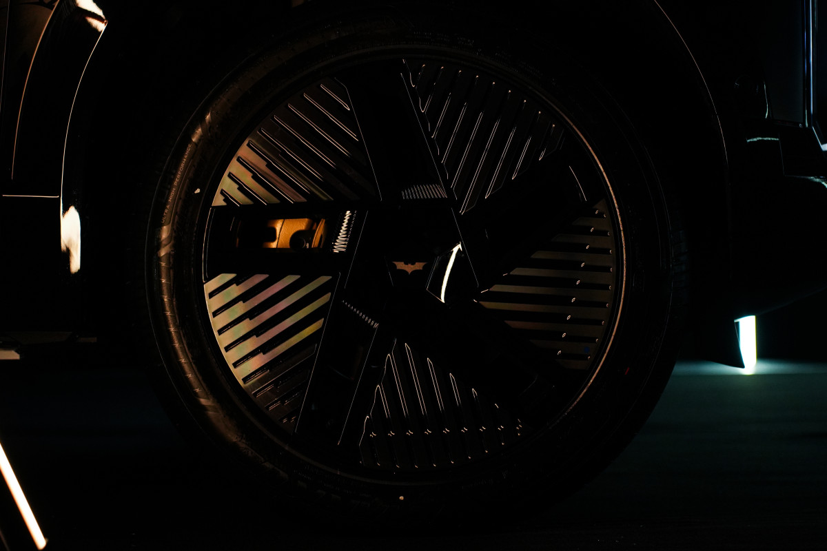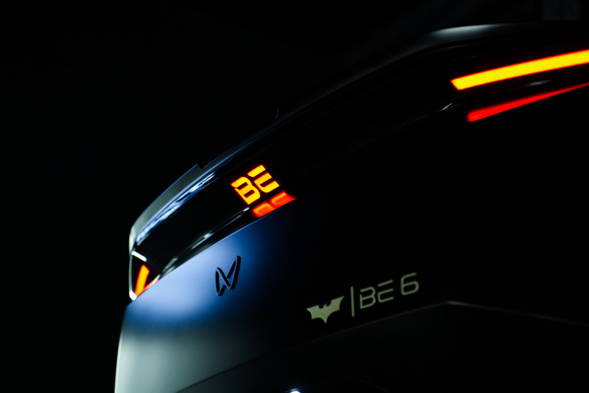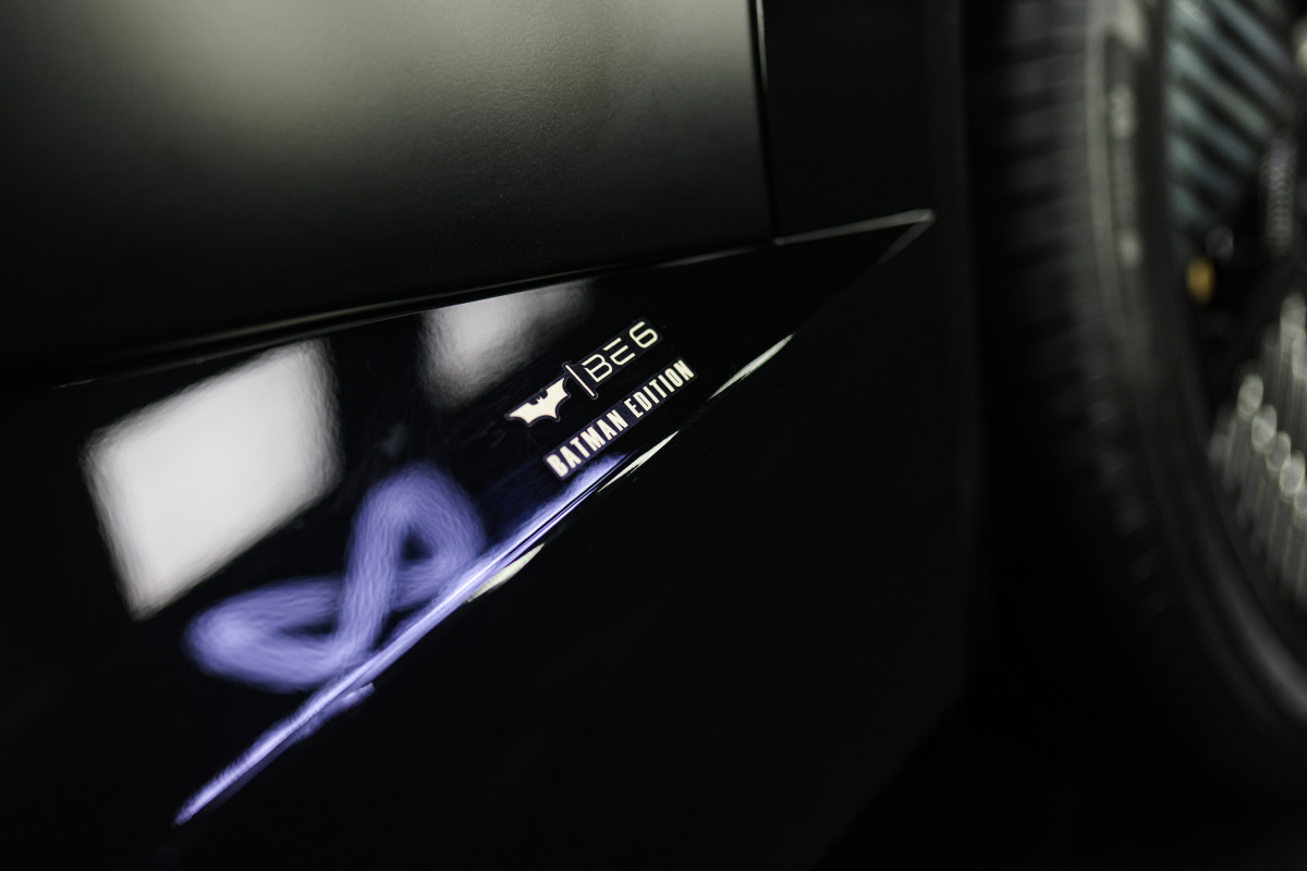 The rear badging reads “BE6 × The Dark Knight,” and the rear door cladding carries a “Batman Edition” signature sticker. It’s stealthy, theatrical, and unmistakably Gotham.