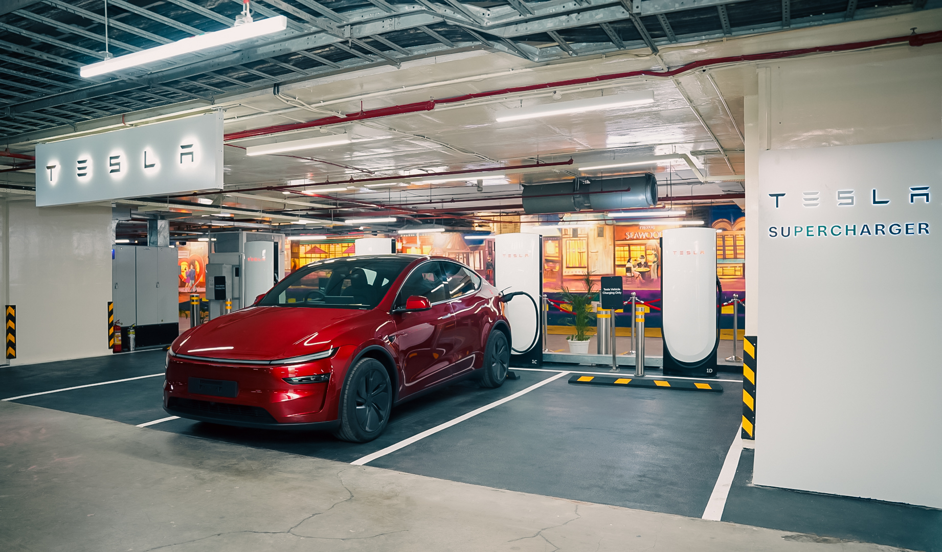 The new station sits in the B1 parking area of the mall and offers a total of eight chargers. You get four V4 Superchargers with peak charging speeds of up to 250 kW. Alongside that, there are four AC destination chargers rated at 11 kW.
